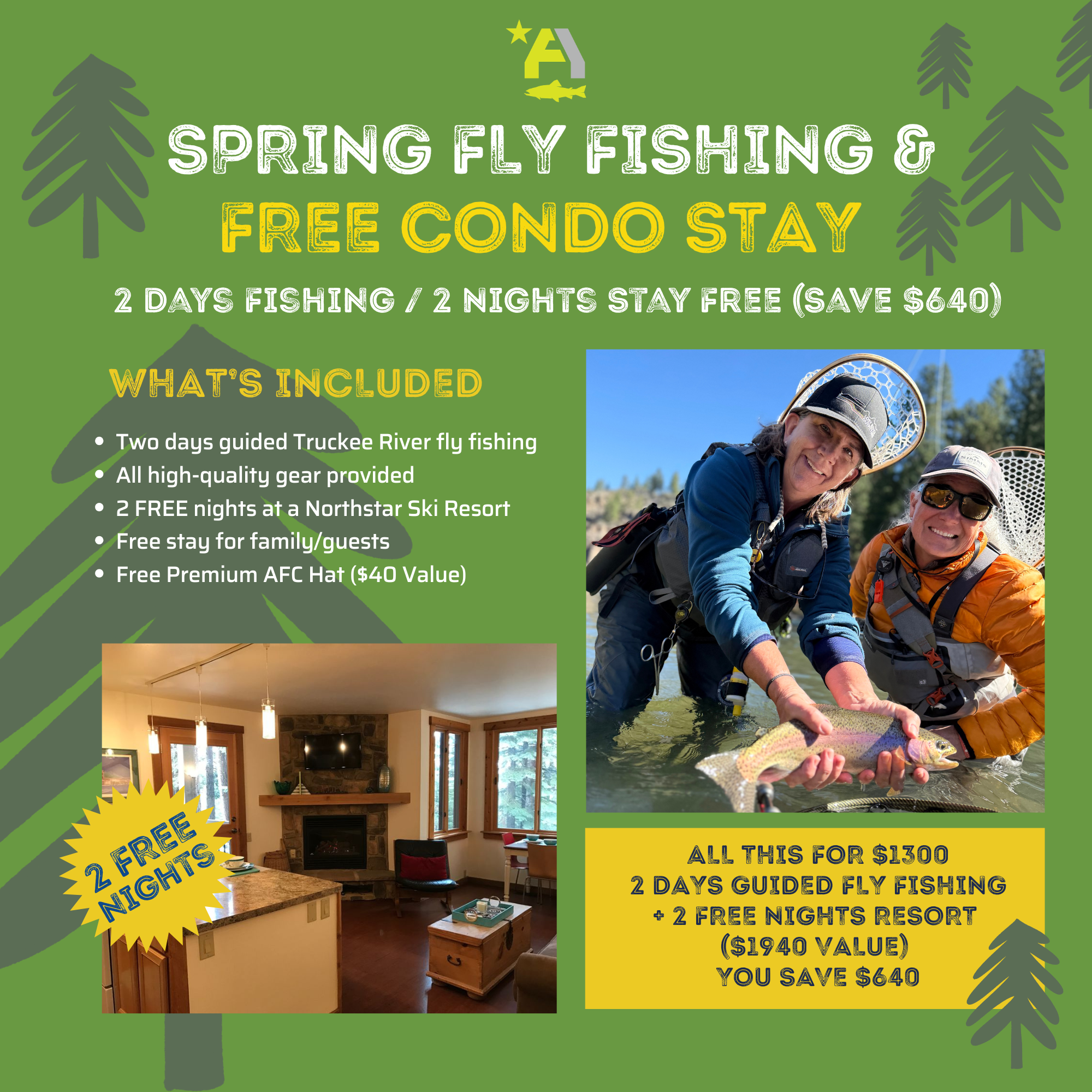Two days of premium guided fly fishing on the legendary Truckee River, all gear included! For a limited time, book your trip and get a 2 FREE night's stay at our Northstar California Resort condo!